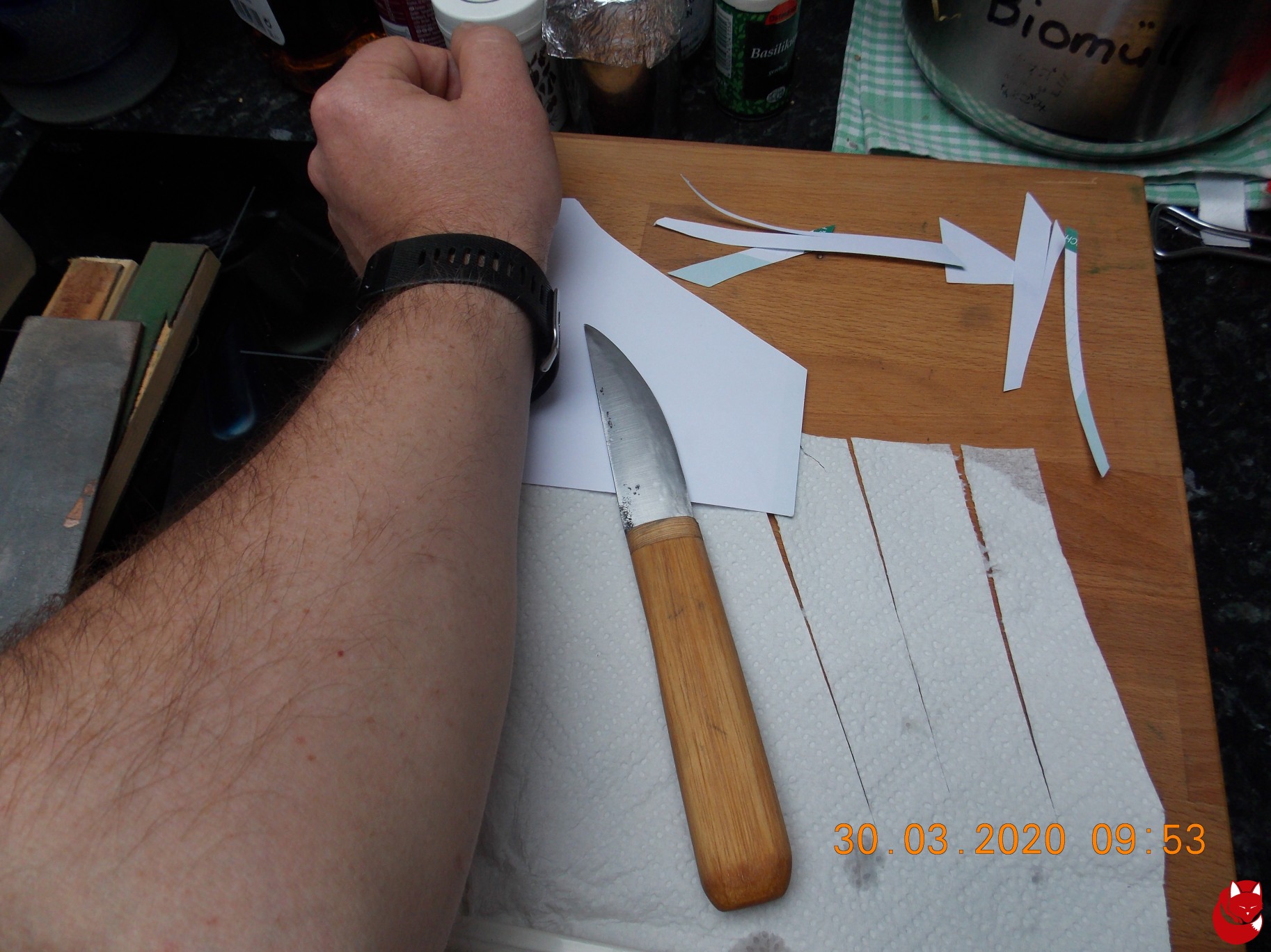 Ab jetzt ist die Schneidkante extrem empfindlich und sollte keinerlei unkontrollierten Kontakt zu anderen Materialien mehr bekommen! Jede unkontrollierte "Kollision" wird die extrem dünne Schneidkante verformen, verbiegen, abstumpfen, oder schlimmstenfalls ausbrechen! Sollte euch ein Missgeschick passieren: Alles auf Anfang - anderenfalls werdet ihr euch schmerzhaft schneiden!